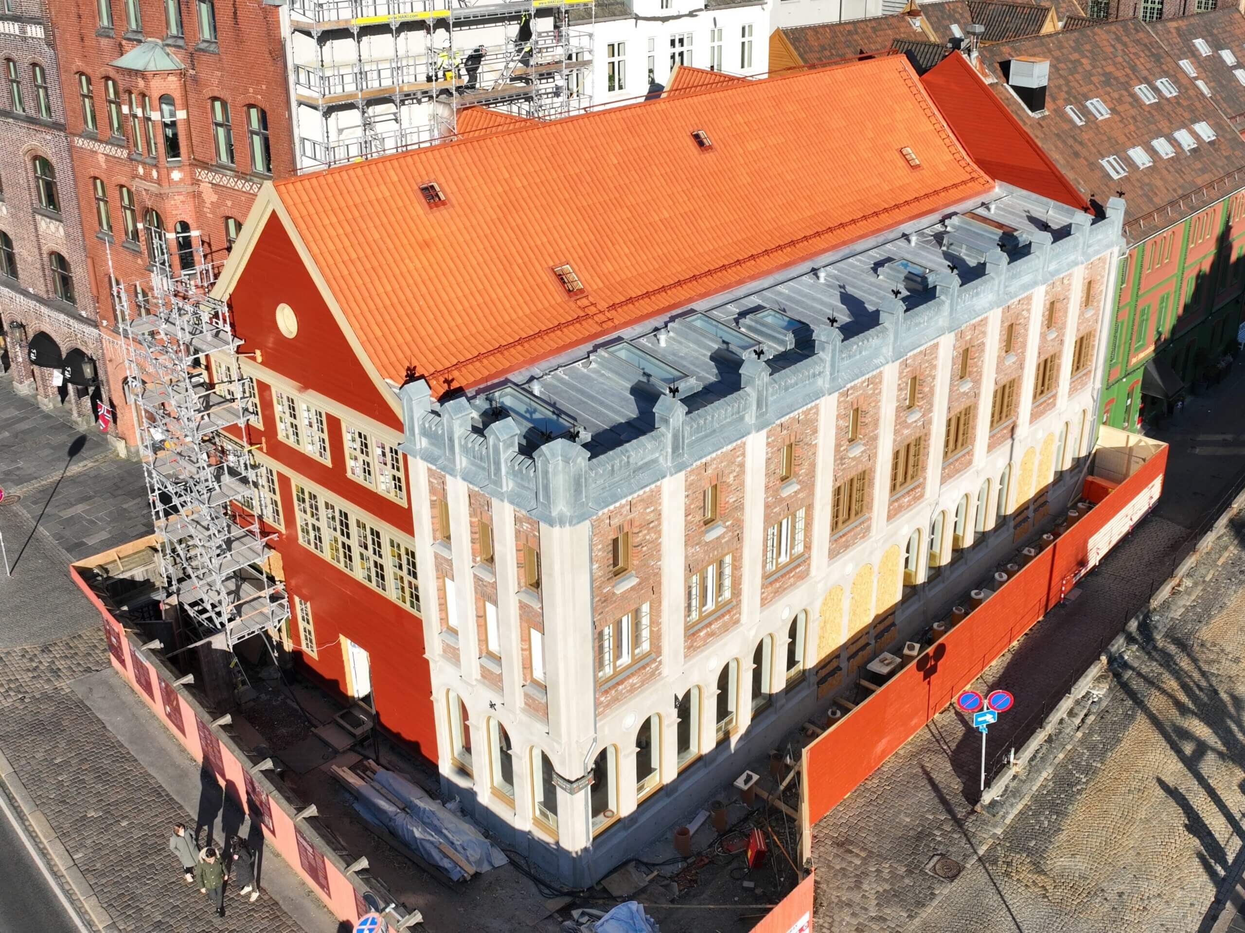Antikvarisk rehabilitering av Hanseatisk museum. Heving og refundamentering av bygget samt restaurering og tilbakeføring til opprinnelig utforming